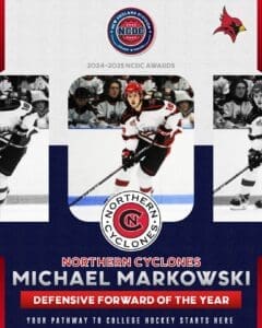 Read MoreBy Joshua Boyd / USPHL.com The National Collegiate Development Conference congratulates the Northern Cyclones’ Michael Markowski for being named the 2024-25 Defensive Forward Of The Year. “It is an honor to be given this award with so many great players in this league,” said Markowski, a 2004-born native of Spring Lake, N.J. “I’ve played…