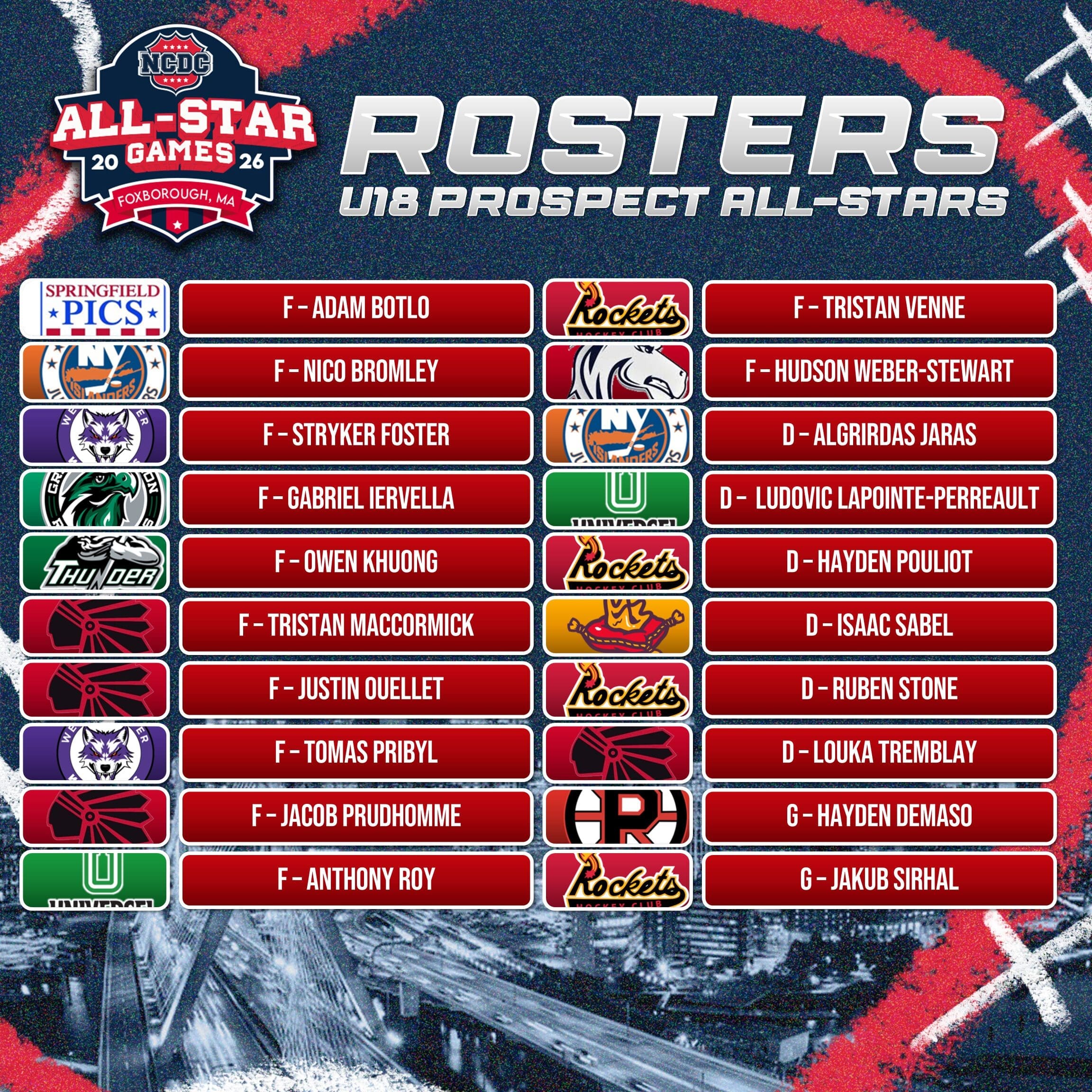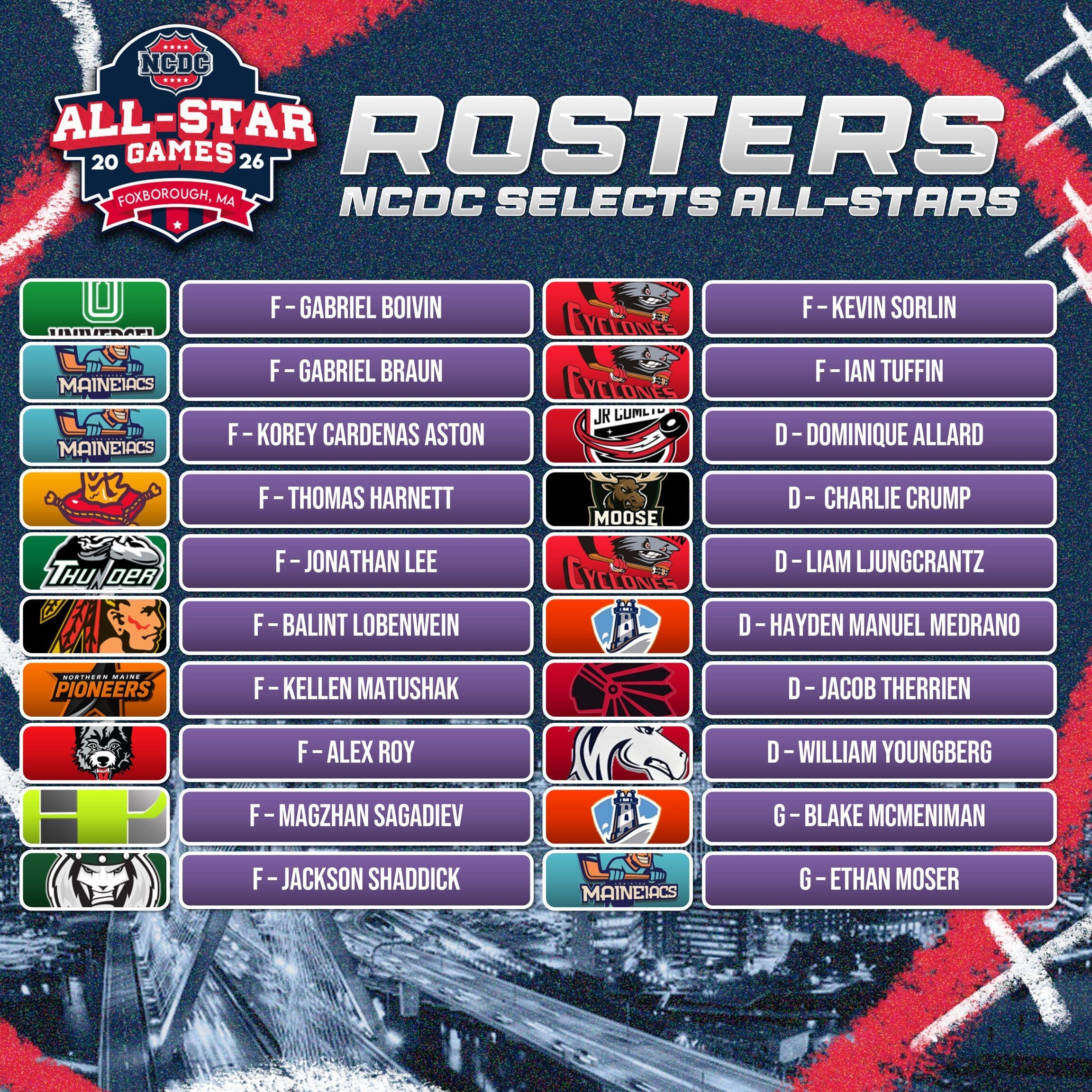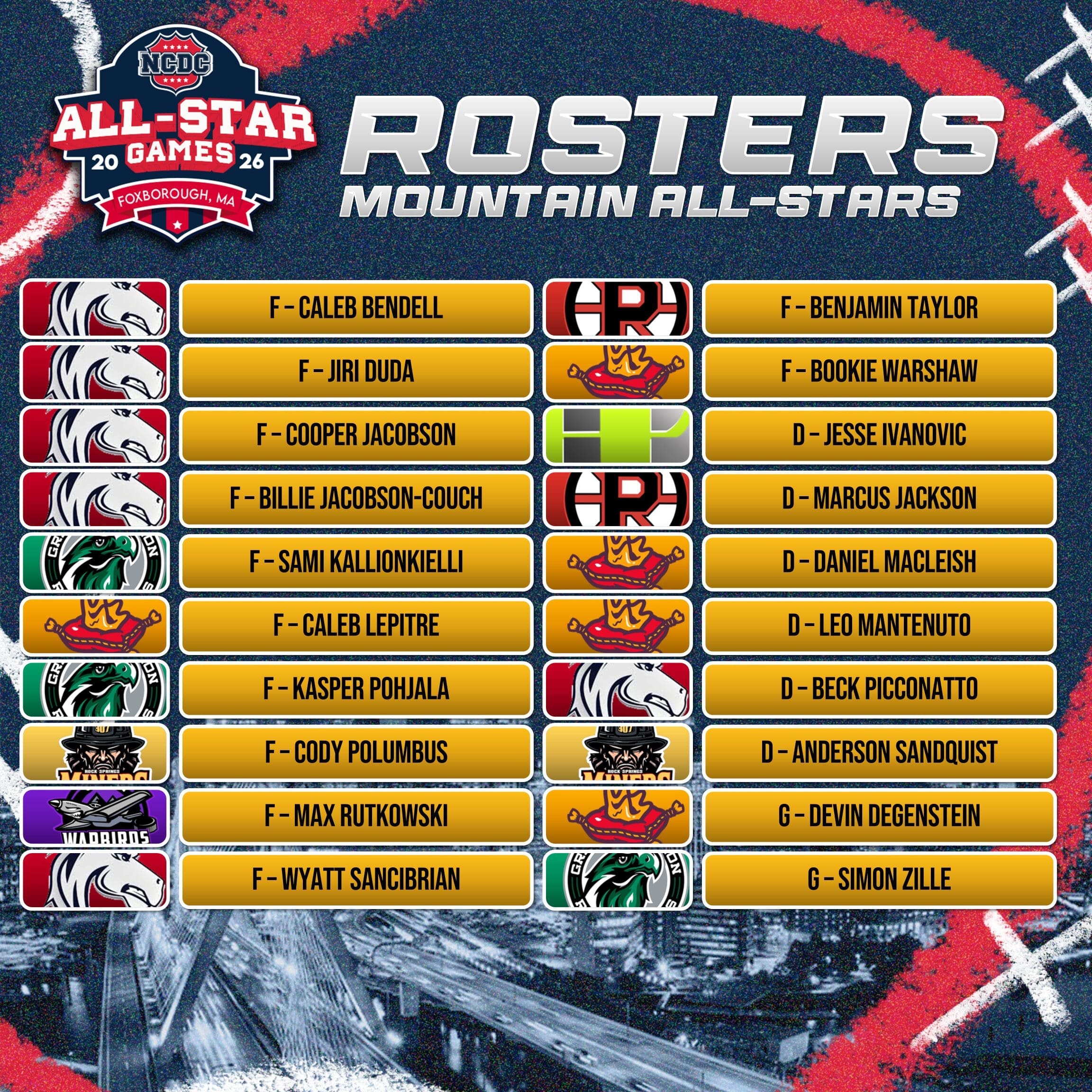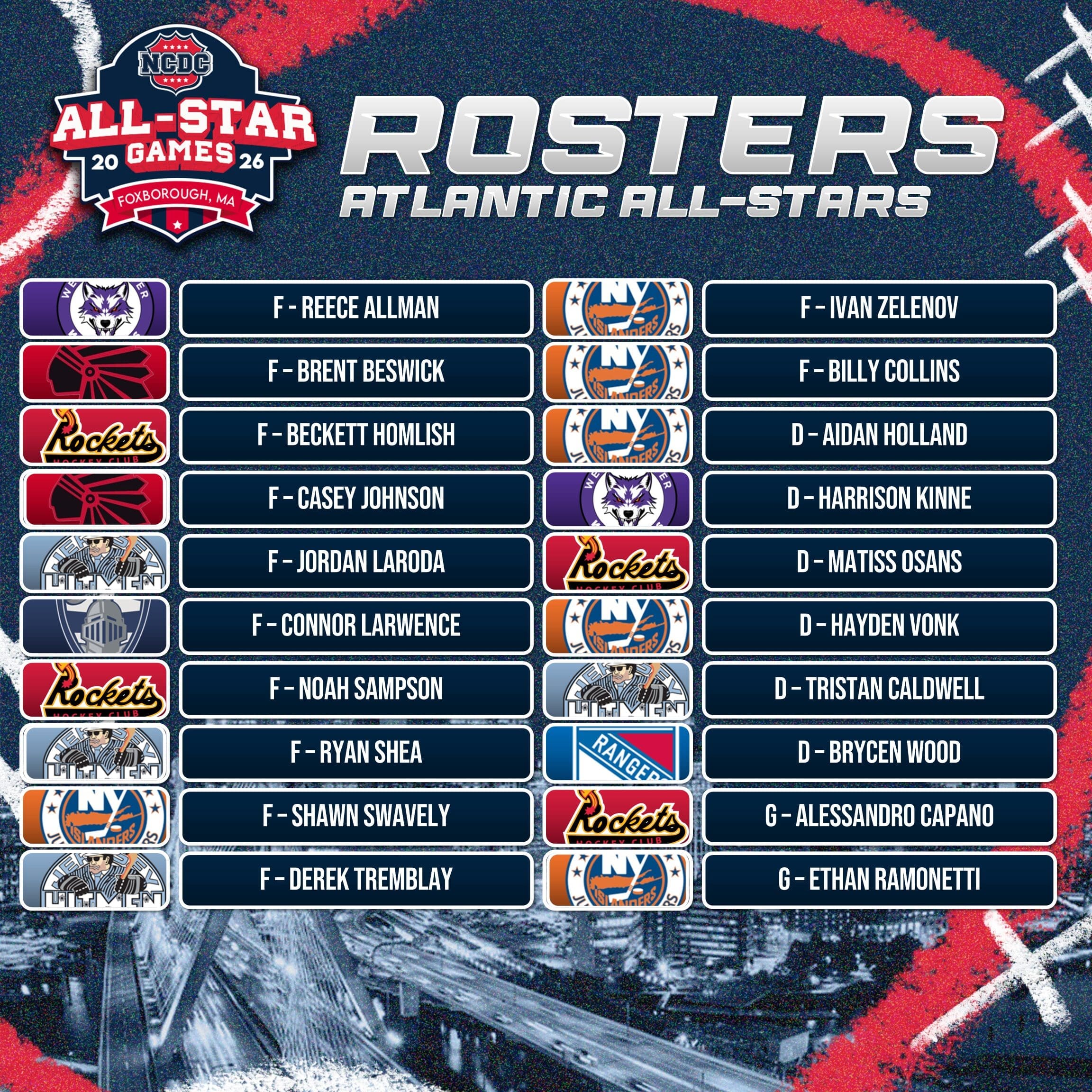 The 2026 event will feature All-Star teams representing the Atlantic, Mountain, New England Green, and New England White conferences, along with NCDC Selects and U18 Prospects teams. Together, these rosters reflect the depth, competitiveness, and developmental focus that define the NCDC as one of junior hockey’s leading pathways to college hockey advancement.