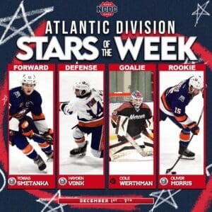 Rookie: Oliver Morris – P.A.L. Jr. Islanders: Rookie forward Oliver Morris had a statement game where he scored twice. Morris added a goal in regulation, then scored the game winner in overtime. Over 18 games played this season, Morris has accumulated 11 points.