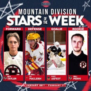 Goalie: Fuzz Aaedt – Rock Springs Miners: Rock Springs netminder Fuzz Aafedt backstopped his team to a huge 2–1 win on Saturday, turning aside 42 of 43 shots for a .977 save percentage in a full 60-minute effort. The victory came on the road against the Ogden Mustangs, the top-ranked team in the Mountain Division, making his performance even more impressive as he helped shut down one of the league’s most dangerous offenses.