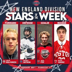 Goalie: Jack Foy – Utica Jr. Comets: Jr. Comets netminder Jack Foy delivered a stellar three-win weekend on the road for Utica, recording back-to-back shutouts with 29 saves against IHC and 21 saves against SSK. He then came in relief against the Boston Junior Bruins after an early 0–3 deficit and turned aside all 30 shots the rest of the way to backstop a 4–3 regulation comeback win. Foy finished the weekend 3-0 and didn’t allow a goal across more than 170 minutes of play, cementing one of the strongest goaltending performances of the season.