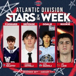 Goalie: John Gazzola – Jersey Hitmen: Hitmen netminder John Gazzola was sensational between the pipes over the week. Gazzola posted a 38 shot shutout win in his lone performance. The New Jersey native now has 3 shutouts on the year along with a 2.05 GAA and a .936 SV%.