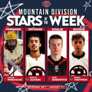 Goalie: Devin Degenstein – Idaho Falls Spud Kings: Spud Kings netminder Devin Degenstein delivered a steady weekend in net for Idaho Falls, posting a 1-1 record while turning aside 45 of 49 shots over two games. He was especially sharp in the Spud Kings’ 5–2 win, stopping 26 of 28 shots, and helped keep his team competitive in an overtime loss with a composed performance under pressure. Degenstein finished the weekend with a .918 save percentage and a 1.98 goals-against average,