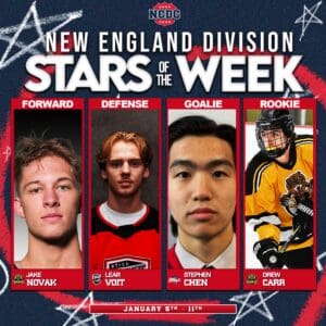 Goalie: Stephen Chen – Boston Jr. Rangers: Boston jr. Rangers goalie Stephen Chen put together an outstanding weekend between the pipes, going 2–0 while facing one of the heaviest workloads of any goaltender. Chen turned aside 74 of 78 shots, highlighted by a shootout win, and finished the stretch with a .949 save percentage and a 1.92 goals-against average.