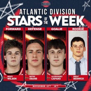 Goalie: Alessandro Capano – Rockets Hockey Club: Alessandro Capano delivered a stellar weekend for the Rockets Hockey Club, going 2–0 while facing 77 shots over two games. He opened with a 32-save performance (.941) in a 3–2 win over Wilkes-Barre/Scranton, then followed with 42 saves on 43 shots (.977) in a 5–1 victory the next night. He finished the weekend with a .961 save percentage, a 1.50 GAA, and 74 total saves.