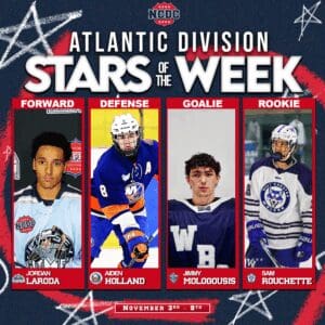 Forward: Jordan Laroda – Jersey Hitmen: Hitmen forward Jordan Laroda posted 4 points over two games for his squad. On Wednesday, Laroda added an assist, then followed up on Thursday adding a goal and two assists in a 6-1 win.