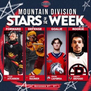 Forward: Tyler Atchison – Idaho Falls Spud Kings: Spud Kings forward Tyler Atchison posted 5 points over two games. On Thursday, Atchison posted a power-play goal in a 5-2 win. On Friday’s 6-3 win, Tyler added two goals, including one on the power-play, and two assists.