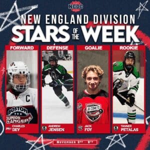 Forward: Charles Dey – Boston Jr. Rangers: Boston Jr. Rangers forward Charles Dey totaled 6 points over 2 games. Dey started the week with a 5 point game, adding 1 goal and 4 assists. On Friday’s 3-2 shootout win, Dey dished out an assist.
