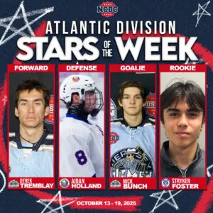 Forward: Derek Tremblay – Jersey Hitmen: Derek Tremblay was a key offensive catalyst this week, helping lead his team to a pair of dominant shutout victories. He opened the week with a three-assist performance in a 6-0 win, showcasing his playmaking ability and vision. Tremblay followed that up by adding a power-play goal in a 7-0 victory, finishing the two-game stretch with four points (1G, 3A).