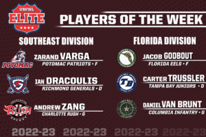Read MoreWeek of Sept. 22, 2022 Southeast Division Forward: Zarand Varga, Potomac Patriots Varga (‘04/Hungary) has enjoyed his new life in North America, scoring eight points already in his first two games off three goals and five assists. Defense: Ian Dracoulis, Richmond Generals The Generals’ ice time leader against Hampton Roads, the third-year General Dracoulis…