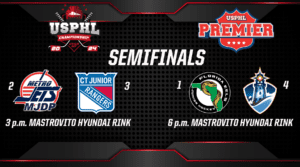 The USPHL Premier semifinals are all set for Monday, as the quarterfinal round on Sunday had some surprises (based on the original Seeding Round results). In the first Semifinal, the Connecticut Jr. Rangers squeaked past the Charlotte Rush on a 2-0 victory that saw goalie Teddy Ecker make 49 saves for a shutout win. Emil…