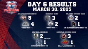 Read MoreNorthern Cyclones 6, South Shore Kings 3 Congratulations to the Northern Cyclones as they bounced back from an early 1-0 deficit to win Game 4 against the South Shore Kings by a 6-3 score, giving them the 2025 New England Division Championship. Keenan Schneider scored twice for the Cyclones, and the trio of Michael Markowski,…
