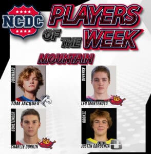 Read MoreWeek of Jan. 8 Games played Jan. 1-6 Forward: Tom Jacques, Ogden Mustangs Jacques (‘04/Lousiville, Ky.) added two assists in both games played with the Ogden Mustangs last week. The forward has 22 points in his second NCDC season, with 73 career games and counting. He has 29 career points. Defense: Leo Mantenuto,…