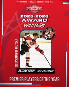 “Bonin was outstanding for us in his age out year,” said Fort Wayne Spacemen Head Coach, Kaleigh Schrock. “His offensive production elevated our team and played a major role in our success, but what stood out most was his commitment to rounding out his game, especially the strides he made defensively. His NCDC call up, combined with the consistent growth he showed each year at the Premier level, is a perfect example of how our league structure develops players, even at the highest end. We are incredibly proud of Antoine and excited to see him take the next step with Adrian’s ACHA Division I program next season,” Schrock added.