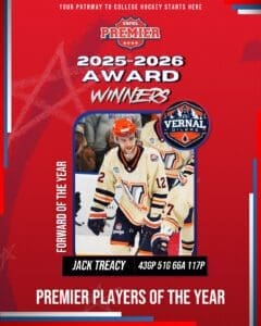 Treacy continued his production in the USPHL Premier Playoffs, posting 14 points (8 goals, 6 assists) in nine games, including two goals in the National Championship game, helping lead Vernal to the title.