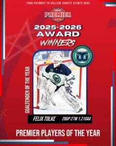 Felix Tolke was the top goaltender in the USPHL Premier this season, delivering consistent results and leading the league across key categories. He posted a 27-1-0 record in 28 games, along with a 1.21 goals-against average, a .956 save percentage, and 10 shutouts.
