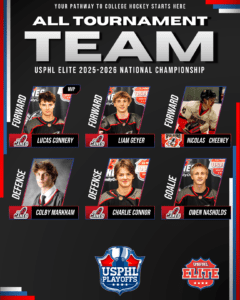 The United States Premier Hockey League (USPHL) announced its Elite Nationals All-Tournament Team. The team consists of three forwards, two defensemen, one goalie and a Most Valuable Player.