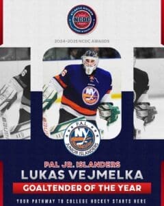 Read MoreBy Joshua Boyd / NCDCHockey.com The National Collegiate Development Conference congratulates P.A.L. Jr. Islanders goaltender Lukas Vejmelka on being named the 2024-25 Atlantic Division Goaltender Of The Year. “I didn’t expect it, but I’m very happy about it. It’s more proof for me that hard work pays off and more motivation to keep going.…