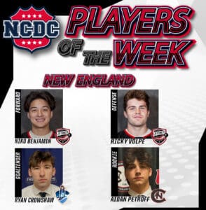 Read MoreWeek of Nov. 12, 2024 Games of Nov. 5-11, 2024 Forward: Niko Benjamin, Utica Jr. Comets The NCDC’s active leader in games played with 158 (good for sixth all-time in NCDC history), Benjamin was huge for the Jr. Comets as they won two of three of their games during their trip to Worcester to…