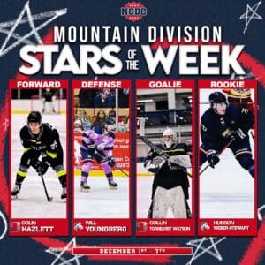 Rookie: Hudson Weber-Stewart – Ogden Mustangs: Mustangs rookie forward Ogden Weber-Stewart tallied 3 points in two games over the week. The Anaheim, CA native posted a goal on Friday, then a goal and an assist on Saturday’s game. Hudson has played in 11 games this season, and has totalled 12 points.