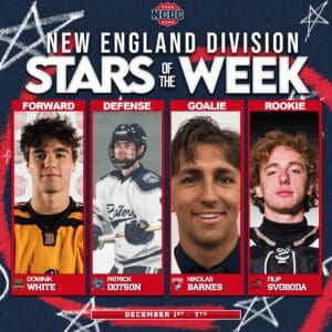 Forward: Dominik White – Boston Jr. Bruins: Boston Jr. Bruins forward Dominik White lit up the scoresheet in just one game last week. White, a Goffstown, NH native, scored a hat-trick and dished out 3 assists for a 6 point night. White is in his first NCDC season and has appeared in 27 games, recording 23 points.