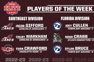Read MoreUSPHL Elite Players Of The Week: Sept. 15, 2022 By USPHL Staff The USPHL congratulates its first group of Players Of The Week, for this week only representing all of the league as only six teams competed last week. Going forward, Players Of The Week will be awarded by Division. Forward: Jake…