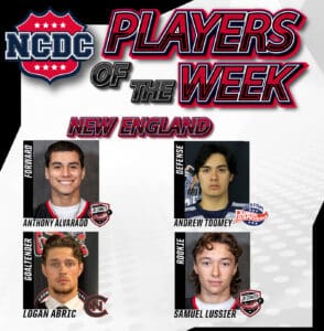 Read MoreThe National Collegiate Development Conference (NCDC) has announced its Atlantic, Mountain, and New England Division Players of the Week, recognizing standout performances from September 15–21, 2025. Only players nominated by their teams were eligible for consideration. Atlantic Division: Forward: Jakub Kristek – Rockets Hockey Club Rockets forward Jakub Kristek (’07) delivered in both games of…