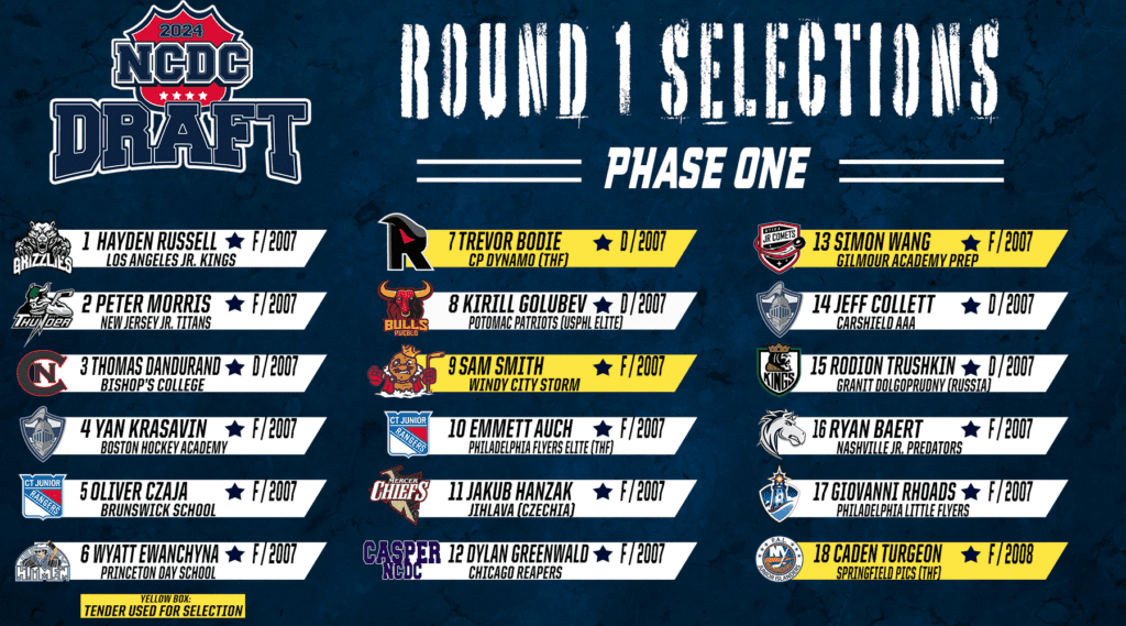 The National Collegiate Development Conference congratulates all of the players who were selected in the 2024 NCDC Draft on Monday, May 13. The Draft was held in two phases – the first in which teams selected players born in 2007 and 2008; and the second four-round phase in which teams selected players born between 2004 and 2006.